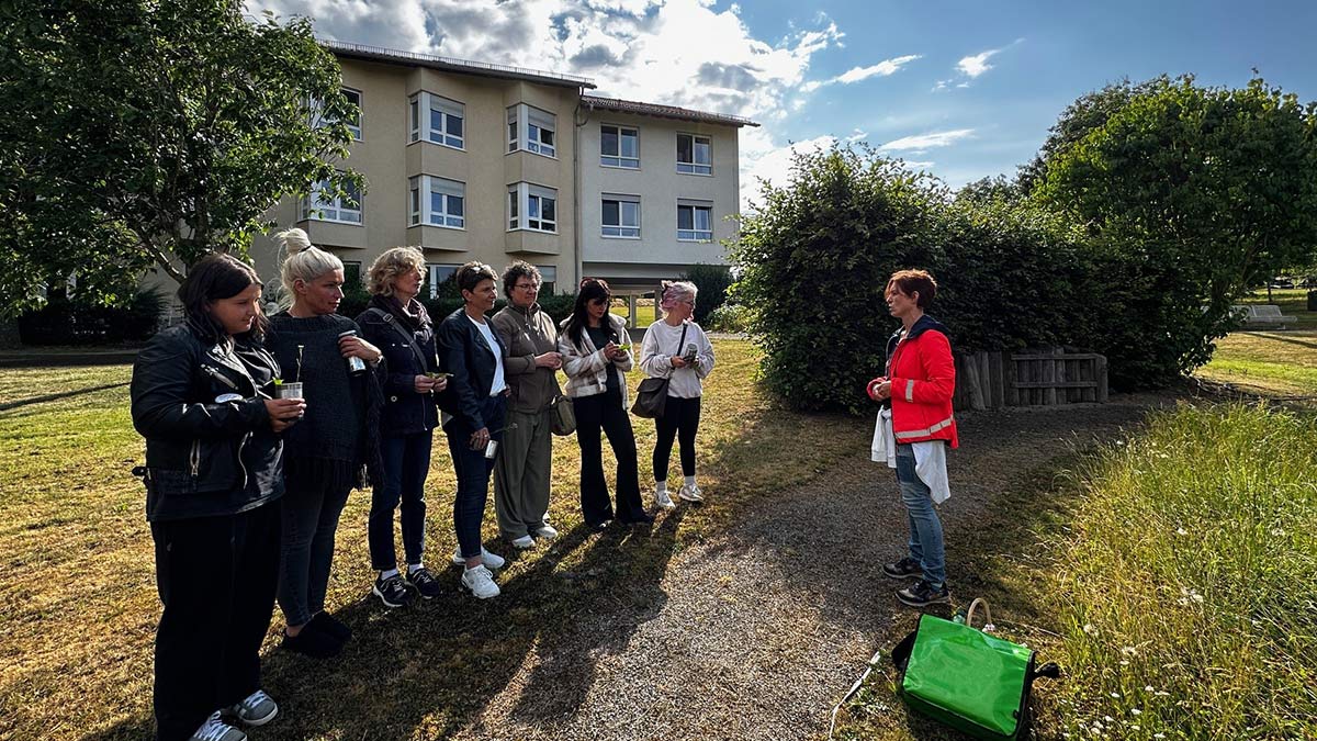 Im „Haus am Brühlpark“ ging es diese Tage raus ins Grüne. Zumindest für einige Mitarbeiter*innen, die sich für dieses Teamevent gefunden hatten. Evylin Vogt war zu Gast. Sie ist Physiotherapeutin, NaturCoach und KräuterPädagogin. Die Expertin hat der Gruppe die schöne grüne Außenanlage der Pflegeeinrichtung näher gebracht – vor allem die Wildkräuter, die dort wachsen und gedeihen. Die interessierten Teilnehmer*innen erfuhren etwa, welche Wildkräuter wie genutzt werden können oder welche als Salat geeignet sind. Aus Schafgarbe, Spitzwegerich und Gänseblümchen wurde gemeinsam eine Heilsalbe und und eine Schüttelkräuterbutter hergestellt. Gebackene Kräuterleckereien, die Evylin Vogt bereits zuhause gebacken hatte, konnten probiert und verköstigt werden. Ein kurzweiliger, interessanter Workshop, dessen Spuren sich vielleicht auch bald auf dem Speiseplan der Senior*innen der Pflegeeinrichtung wiederfinden lassen.